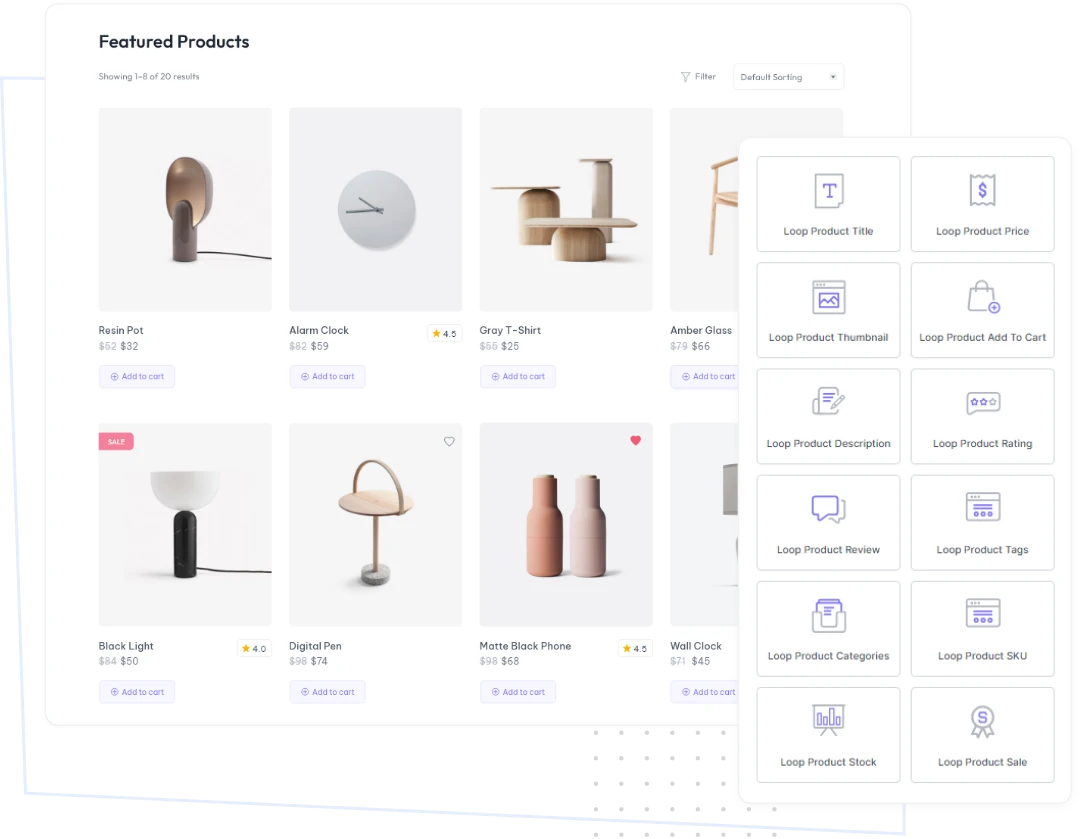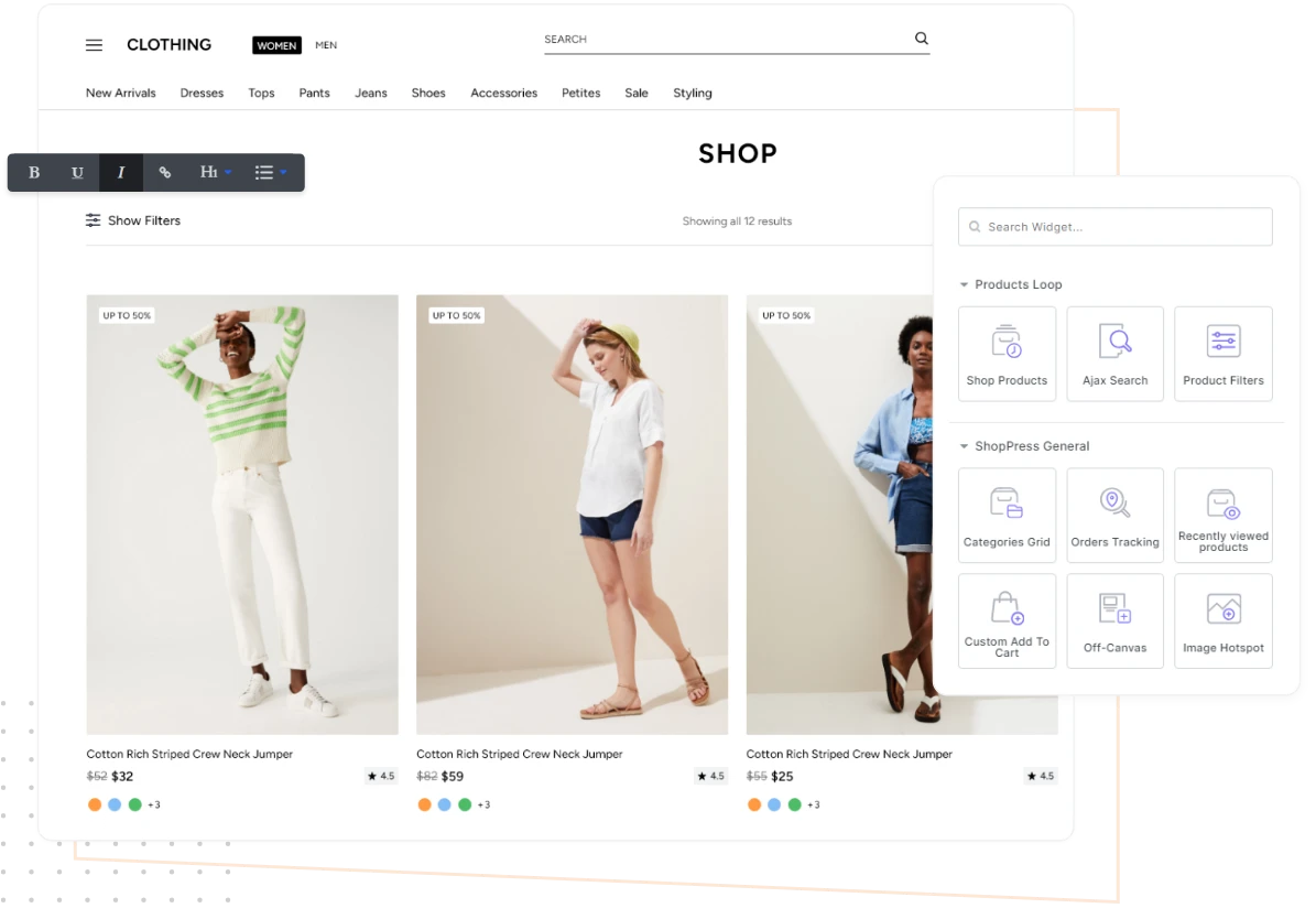 Product FilterShopPress Builder offers this option and it allows your users to simply filter products by Category, Brand, Color, Rating, Tag, Size and Price, and find what they are looking for in a matter of seconds.